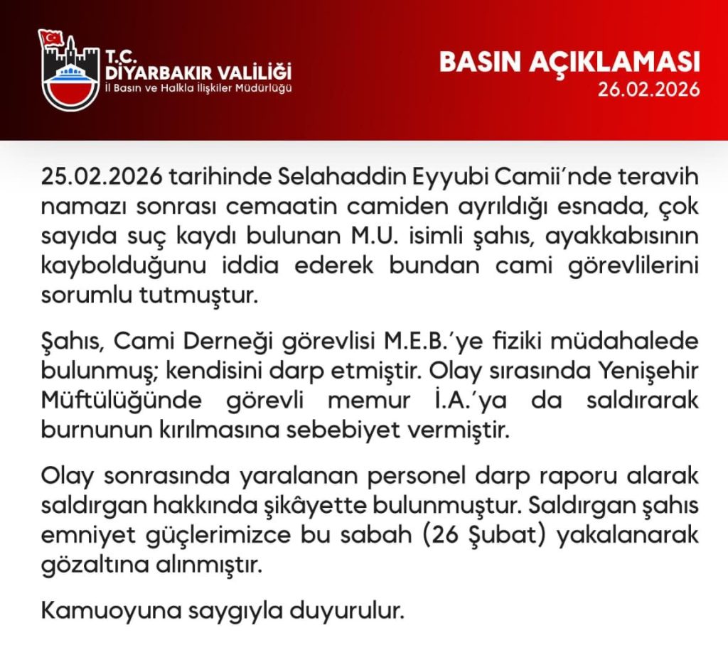 Diyarbakır Valiliği, gittiği camide teravih namazı sonrası ayakkabısını bulamadığı gerekçesiyle tartıştığı görevlilere tekme ve yumruklarla saldıran M.U.’nun gözaltına alındığını duyurdu. Valilik açıklamasında, “25 Şubat 2026 tarihinde Selahaddin Eyyubi Camii’nde teravih namazı sonrası cemaatin camiden ayrıldığı esnada, çok sayıda suç kaydı bulunan M.U. isimli şahıs, ayakkabısının kaybolduğunu iddia ederek bundan cami görevlilerini sorumlu tutmuştur. Şahıs, Cami Derneği görevlisi M.E.B.’ye fiziki müdahalede bulunmuş; kendisini darbetmiştir. Olay sırasında Yenişehir Müftülüğünde görevli memur İ.A.’ya da saldırarak burnunun kırılmasına sebebiyet vermiştir. Olay sonrasında yaralanan personel darp raporu alarak saldırgan hakkında şikayette bulunmuştur. Saldırgan şahıs emniyet güçlerimizce bu sabah 26 Şubat yakalanarak gözaltına alınmıştır” denildi.